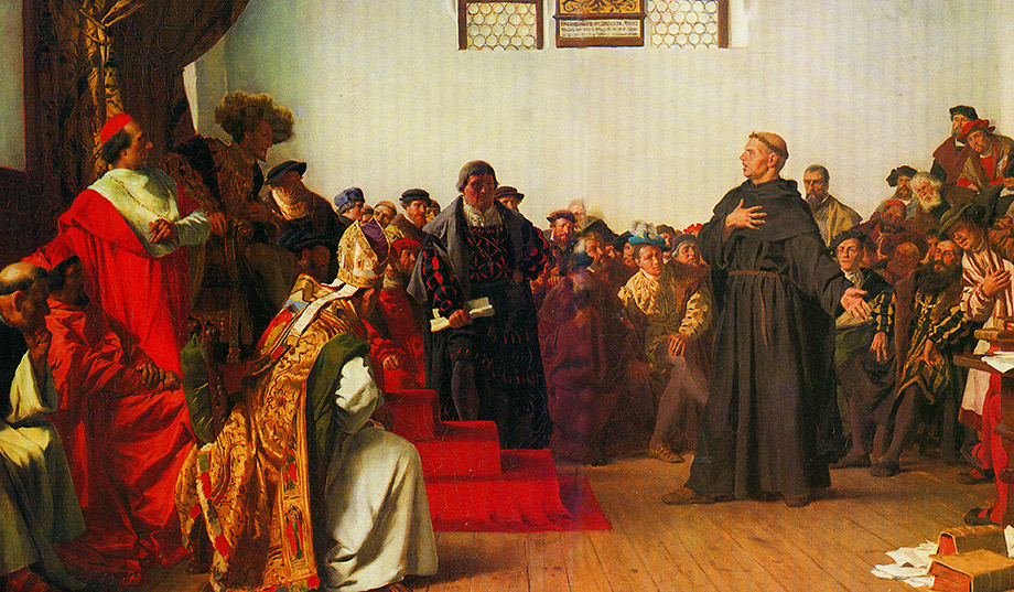 Martin Luther (1483-1546) was an Augustinian monk and university lecturer in Wittenberg when he composed his “95 Theses,” which protested the pope’s sale of reprieves from penance, or indulgences. Although he had hoped to spur renewal from within the church, in 1521 he was summoned before the Diet of Worms and excommunicated. Sheltered by Friedrich, elector of Saxony, Luther translated the Bible into German and continued his output of vernacular pamphlets.